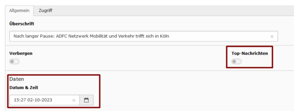 Um einen importierten, älteren Artikel aus einer anderen Gliederung im Frontend "oben" zu halten, kann der Nutzer das zweite Datumsfeld nutzen, um eine chronologische Reihenfolge festzulegen. Wird also ein zukünftiges Datum gewählt steht der Artikel an erster Stelle.